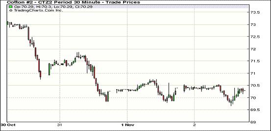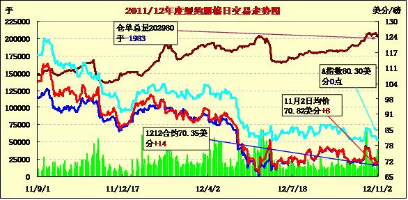 11月2日,紐約期棉市場低部小幅波動,漲跌互現(xiàn),12月合約結算價70.35美分/磅,漲14點,1303月合約71.44美分,跌6點。外部商品市場因美元上漲整體承壓,期棉亦有壓力,市場交易以近期12月合約轉倉交易為主。與前兩個交易日相同,2日12月合約在70美分一線窄幅波動,當其盤中跌破70美分后因技術性買盤反彈,終收于該支撐位以上,其他合約波幅不大,多數微跌。12月合約跌至70美分,現(xiàn)貨市場詢盤增加,對近期合約形成支持。據美國農業(yè)部(USDA)報告,10.19-25日一周美國凈簽約出口本年度陸地棉21954噸,較前一周增加1.8倍,但較近四周平均低36%;裝運25106噸,較前一周增加81%,但較近四周平均低10%;簽約出口本年度皮馬棉658噸、裝運4173噸;凈簽約出口2013/14年度陸地棉839噸。