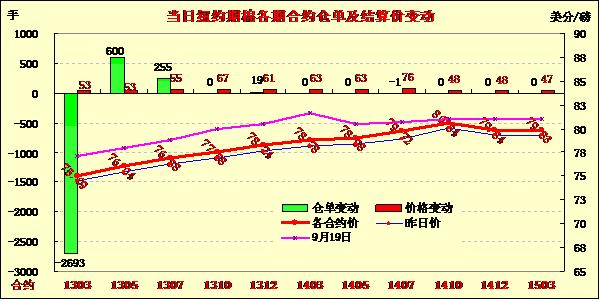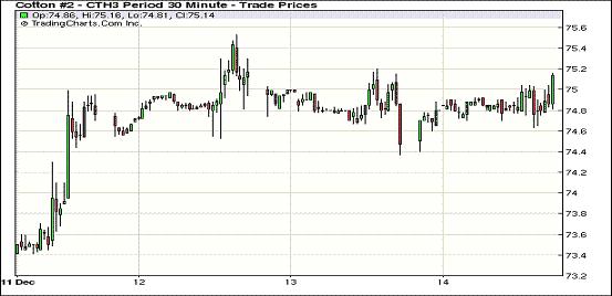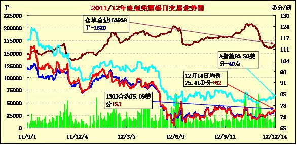 12月14日,受美元走低、外部商品市場普遍走高支持,紐約期棉各合約中幅反彈,近期12月合約收于73.79美分/磅,漲24點(diǎn);1303合約75.09美分/磅,漲53點(diǎn);1305月合約結(jié)算價(jià)76.04美分/磅,漲53點(diǎn);其他遠(yuǎn)期合約漲幅48-76點(diǎn)不等。當(dāng)日市場大部分時(shí)間圍繞74.85美分一線振幅震蕩,尾盤時(shí)分在美元走低、外部商品市場走高的支持下,非商業(yè)買盤入市促期棉反彈走高,主力合約再次突破75美分阻力位,盤終收于75美分之上。當(dāng)周主力1303月合約累計(jì)漲39點(diǎn);1305月合約漲52點(diǎn)。