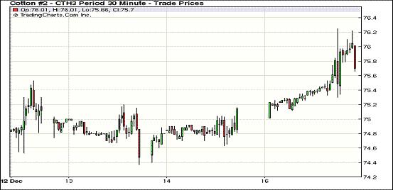 12月17日,雖然外部商品市場(chǎng)整體走弱,但紐約期棉在商業(yè)買盤支持下多數(shù)合約繼續(xù)收漲,主力1303月合約結(jié)算價(jià)75.85美分/磅,漲76點(diǎn);1305月合約結(jié)算價(jià)76.66美分/磅,漲62點(diǎn)。當(dāng)日市場(chǎng)低開高走,商業(yè)買盤強(qiáng)勁促主力合約一路上揚(yáng),午盤后突破76美分,當(dāng)日最高至76.25美分/磅,尾盤時(shí)買盤獲利平倉(cāng)回吐部分漲幅,盤終該合約收于9月20日以來(lái)最高點(diǎn)。除最后兩份合約外,其他合約也小幅或中幅收漲。分析認(rèn)為,期棉收漲主要受以下兩個(gè)因素的支持;一,市場(chǎng)預(yù)期下年度全球植棉面積縮減;二,目前全球經(jīng)濟(jì)已經(jīng)見(jiàn)底,今后有望觸底反彈。主力1303月合約有望挑戰(zhàn)78美分阻力位。