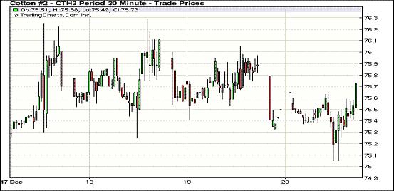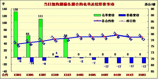 12月20日,外部谷物商品市場再次走低,紐約期棉受累延續(xù)前一日的跌勢繼續(xù)收跌,主力1303月合約結(jié)算價(jià)75.83美分/磅,跌6點(diǎn);1305月合約結(jié)算價(jià)76.48美分/磅,跌14點(diǎn)。當(dāng)日期棉市場微幅低開,主力合約早盤震蕩下行,新一期的美棉出口周報(bào)對(duì)市場影響有限,外圍谷物市場繼續(xù)走低對(duì)期棉形成壓力,該合約當(dāng)日在75.05-75.88美分間震蕩,震蕩幅度83點(diǎn),盤終除1310月合約微幅收漲外,其他合約普遍走低。期棉近兩日回吐了部分本周初期的漲幅,市場在圣誕及新年假期前交投清淡,預(yù)計(jì)節(jié)前不會(huì)有大的作為。