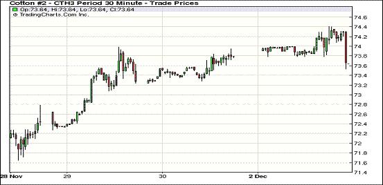 12月3日,受澳大利亞、巴西等產(chǎn)棉國(guó)植棉面積大幅下降及空頭平倉(cāng)支持,紐約期棉前七份合約繼續(xù)收漲,近期1212月合約結(jié)算價(jià)72.93美分/磅,漲28點(diǎn);主力1303月合約結(jié)算價(jià)73.98美分/磅,漲7點(diǎn)。當(dāng)日市場(chǎng)早盤運(yùn)行較為平穩(wěn),主力合約主要圍繞73.90美分/磅震蕩。后市場(chǎng)炒作澳大利亞及巴西新花植棉面積大減,此外趨勢(shì)跟蹤基金及指數(shù)基金空頭平倉(cāng)也對(duì)市場(chǎng)形成支持,該合約突破74美分/磅阻力位,當(dāng)日最高至74.41美分/磅;尾盤時(shí)分買盤獲利平倉(cāng)致市場(chǎng)高位回落,該合約未能守住漲勢(shì),但盤終仍微幅收高并處于近五周高位。當(dāng)日外部谷物商品除小麥外也普遍收高。澳大利亞2012/13年度植棉面積同比縮減30%,巴西植棉面積也大幅下降,產(chǎn)量同比減27%,至630萬(wàn)包,低于美國(guó)農(nóng)業(yè)部(USDA)11月份預(yù)測(cè)數(shù)據(jù)。