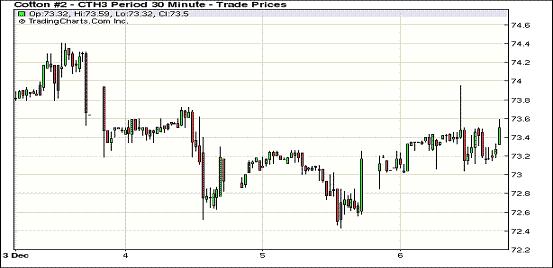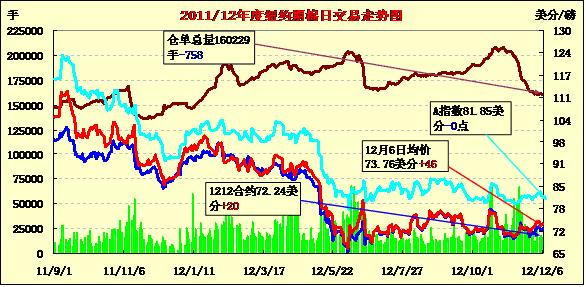 12月6日,受美棉出口周報(bào)數(shù)據(jù)利好支持,紐約期棉繼續(xù)反彈格局,近期1212月合約結(jié)算價(jià)72.24美分/磅,漲20點(diǎn);主力1303月合約結(jié)算價(jià)73.55美分/磅,漲51點(diǎn)。當(dāng)日市場(chǎng)早盤缺乏方向指引,主力合約主要在73.2-73.5美分之間震蕩,后美國(guó)農(nóng)業(yè)部公布的美棉出口周報(bào)數(shù)據(jù)利好促市場(chǎng)快速走高,該合約至當(dāng)日最高點(diǎn)73.95美分。午盤后市場(chǎng)對(duì)美國(guó)財(cái)政懸崖的憂慮打壓期棉回落回吐部分漲幅,盤終除1310月合約外,其他合約普遍收漲。據(jù)美國(guó)農(nóng)業(yè)部(USDA),11.23-11.29一周美國(guó)凈簽約出口本年度陸地棉94279噸(較前一周增38%,較近四周平均值增25%),為本年度以來最高周數(shù)據(jù);裝運(yùn)47831噸(較前一周增66%,較近四周平均值增76%)。