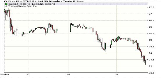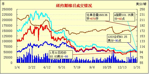 1月31日,外部大宗商品市場漲跌互現(xiàn),紐約期棉在賣盤打壓下近跌遠漲,主力1203月合約結(jié)算價93.25美分/磅,跌90點,1205月合約結(jié)算價94.51美分/磅,跌36點。市場交易活躍,成交量超過3萬手。當(dāng)日市場早盤受鄭棉期貨上漲支撐小幅高開,主力合約震蕩上行至當(dāng)日高點95.29美分/磅;午盤后因美元走強及歐美股市走低拖累,該合約回落至當(dāng)日低點93.11美分/磅,震蕩幅度218點;尾盤略有反彈,盤終該合約大幅告跌,達1月份新低。外部大豆、小麥及玉米期貨走高,原油期貨走低。各方目前將關(guān)注點轉(zhuǎn)移到棉花春季種植意向上,據(jù)悉美國棉花協(xié)會將于本周五公布其2012年棉花種植面積預(yù)測報告。
