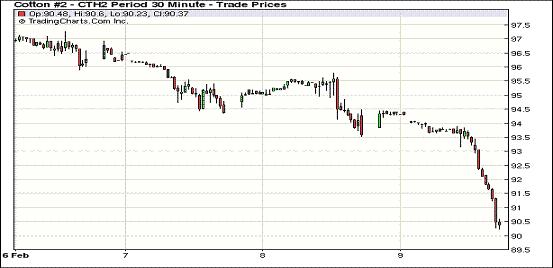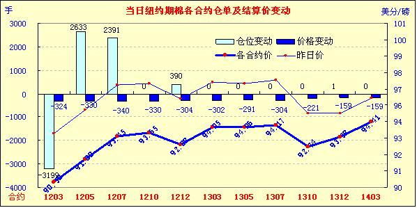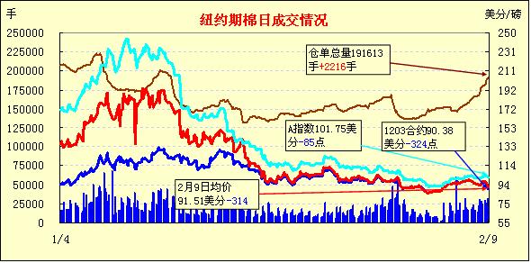 2月9日,因美國農(nóng)業(yè)部(USDA)最新棉花供需預測報告利空及指數(shù)基金展期繼續(xù)對市場形成打壓,紐約期棉連續(xù)第三個交易日大幅收跌,近期1203月合約結算價90.38美分/磅,跌324點,1205月合約結算價91.88美分/磅,跌330點,其他遠期合約跌幅159-340點不等。市場交易活躍,成交量超過6萬手。當日市場早盤窄幅震蕩,基本面利空導致賣盤涌入,打壓市場一路走低,盤中近期3月合約最低至90.23美分/磅,為去年12月30日以來最低點;5月合約最低至91.81美分/磅,震蕩幅度426點;尾盤時期棉雖有微幅反彈,但盤終各合約均大幅收跌。昨日美棉出口表現(xiàn)平平,美國農(nóng)業(yè)部2月份最新供需預測報告中棉花期初庫存及產(chǎn)量調增,消費調減,期末庫存大幅調增,這對期棉造成壓力;此外近期3月合約臨近交割期,指數(shù)基金持倉展期連續(xù)第三個交易日致期棉承壓。
