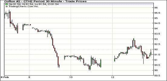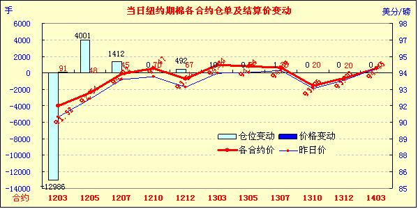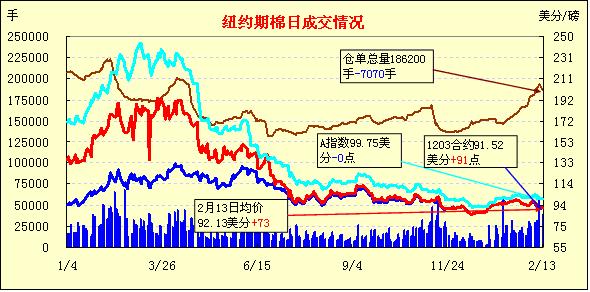 2月13日美元指數(shù)走強(qiáng),美股及外部商品市場(chǎng)普遍走高;基本面上美國(guó)國(guó)家棉花總會(huì)預(yù)計(jì)美下年度植棉面積下降,在上述利好因素支持下,紐約期棉繼續(xù)維持上周五的漲勢(shì),近期1203月合約結(jié)算價(jià)91.52美分/磅,漲91點(diǎn),1205月合約結(jié)算價(jià)92.54美分/磅,漲48點(diǎn),其他遠(yuǎn)期合約也普遍小幅或中幅收漲。當(dāng)日市場(chǎng)開(kāi)盤(pán)后震蕩上行,近期3月合約至當(dāng)日最高點(diǎn)93.05美分/磅,5月合約最高至94.18美分/磅;后賣(mài)盤(pán)涌入,期棉承壓下跌,3月及5月合約震蕩幅度分別為243點(diǎn)和240點(diǎn);交易后段期棉在外部商品市場(chǎng)普遍走高帶動(dòng)下低點(diǎn)反彈,盤(pán)終各合約均告漲。昨日希臘議會(huì)批準(zhǔn)緊縮措施,市場(chǎng)對(duì)歐債危機(jī)解決前景看好促使商品市場(chǎng)普遍上漲;據(jù)NCC(美國(guó)國(guó)家棉花總會(huì)),2012年美國(guó)棉花種植面積預(yù)計(jì)為1362.8萬(wàn)英畝,同比減少7.5%,這對(duì)期棉形成利好支撐,當(dāng)日普遍小幅或中幅上漲。