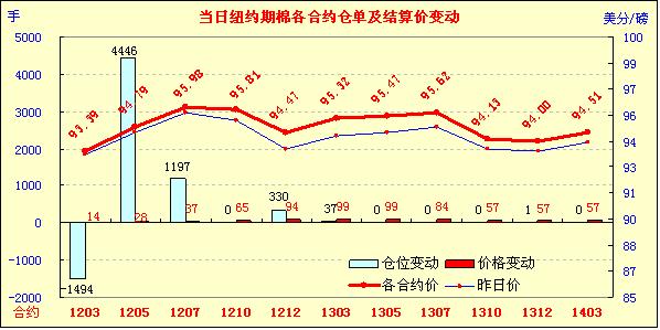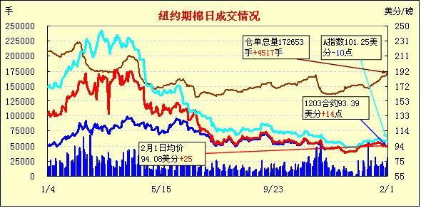2月1日,因全球范圍內(nèi)公布的制造業(yè)數(shù)據(jù)利好,歐美股市及外部谷物市場全線走高,紐約期棉受鼓舞也以上漲收盤,主力1203月合約結(jié)算價93.39美分/磅,漲14點,1205月合約結(jié)算價94.79美分/磅,漲28點。當日市場小幅高開后震蕩走低,盤中受經(jīng)濟數(shù)據(jù)利好支撐,主力3月合約最高至94.21美分/磅,5月合約最高至95.52美分/磅;后買盤獲利,市場承壓回落回吐部分漲幅,盤終各合約均告漲。因指數(shù)基金調(diào)倉及買盤支撐,5月合約收盤價高出3月合約140點。當日公布的中國和歐洲公布的制造業(yè)數(shù)據(jù)以及美國私人部門新增就業(yè)人數(shù)數(shù)據(jù)表現(xiàn)較為強勁,這提振了市場人氣,促使股市及商品市場普遍上漲。美國農(nóng)業(yè)部(USDA)將于今日公布上一周的美棉出口周報,期棉市場期待其進一步指引。