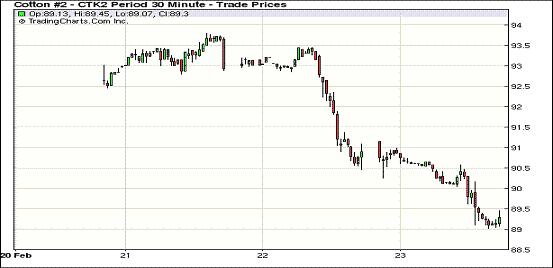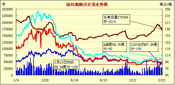 2月23日,紐約期棉延續(xù)前一日的跌勢(shì)再次大幅走低,主力5月合約結(jié)算價(jià)89.23美分/磅,跌130點(diǎn),近期3月合約結(jié)算價(jià)87.48美分/磅,跌109點(diǎn),其他遠(yuǎn)期合約跌幅68-135點(diǎn)不等。當(dāng)日市場(chǎng)高開(kāi)低走,主力5月合約當(dāng)日最低至89.01美分/磅,震蕩幅度達(dá)300點(diǎn);雖盤(pán)中美棉2012年種植面積減少對(duì)期棉形成一定支撐,促其午盤(pán)后略有反彈,但盤(pán)終各合約均以大跌收盤(pán),主力合約跌破90美分,收于12月底以來(lái)最低點(diǎn)。