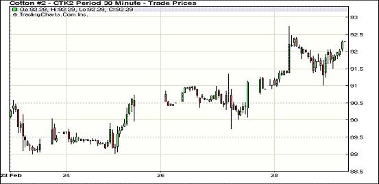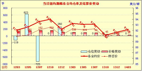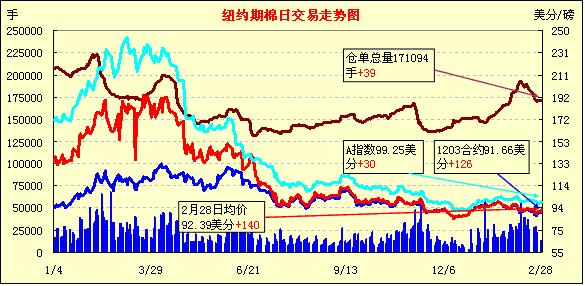 2月28日,受美元走低、美股及外部谷物市場(chǎng)全面走高提振,紐約期棉連續(xù)第三個(gè)交易日收漲,近期3月合約結(jié)算價(jià)91.66美分/磅,漲126點(diǎn),主力5月合約結(jié)算價(jià)92.24美分/磅,漲157點(diǎn),其他遠(yuǎn)期合約漲幅25-162點(diǎn)不等。當(dāng)日市場(chǎng)開(kāi)盤(pán)后震蕩走高,主力1205月合約上行至當(dāng)日最高點(diǎn)92.74美分/磅;后買(mǎi)盤(pán)獲利平倉(cāng),打壓市場(chǎng)高位回落;尾盤(pán)時(shí)在外部谷物市場(chǎng)帶動(dòng)下強(qiáng)勢(shì)反彈,盤(pán)終前7份合約漲幅過(guò)百。當(dāng)日外部大豆、玉米及小麥期貨走高,原油期貨走軟。