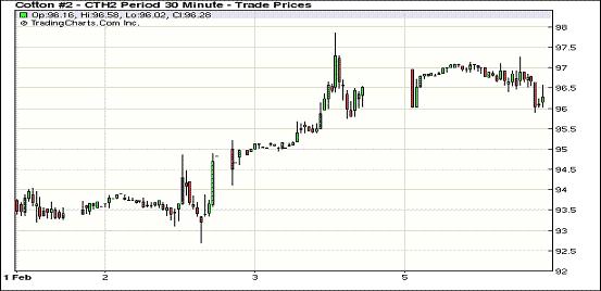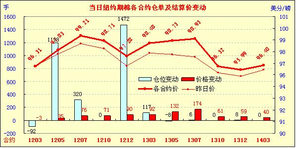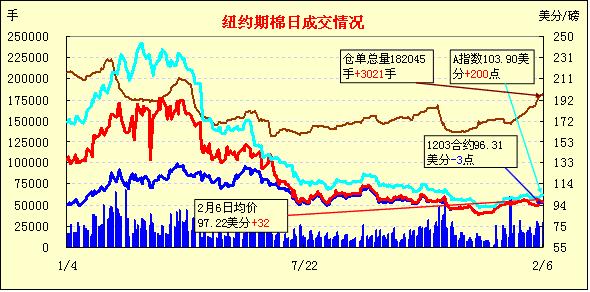 2月6日,紐約期棉市場多數(shù)合約以上漲收盤,近期3月合約結(jié)算價96.31美分/磅,跌3點,1205月合約97.83美分,漲35點。市場密切關(guān)注USDA(美國農(nóng)業(yè)部)全球供需月報和NCC(美國國家棉花總會)美棉新花預測報告動態(tài),觀望態(tài)度漸濃。上周五市場全面收漲主要得益于美國相關(guān)經(jīng)濟數(shù)據(jù)的提振,6日市場上半場交易穩(wěn)中有漲,交易中期3月合約在96.6-97美分之間窄幅波動,5月合約在97.8-98.4美分間波動;交易尾段因缺乏買盤跟進,市場回吐部分盤中漲幅,最終3月合約弱勢收盤,其他合約以35-174點不等幅度收漲。