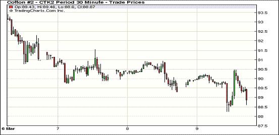 紐約期棉USDA預(yù)測報(bào)告調(diào)高庫存期棉四連陰(3-9)