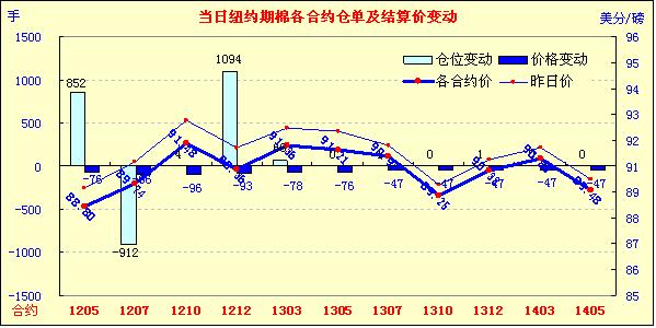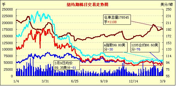 3月9日,印度政府開會(huì)宣布繼續(xù)推行棉花出口禁令,美國農(nóng)業(yè)部最新預(yù)測全球棉花消費(fèi)調(diào)減及期末庫存調(diào)增,紐約期棉承壓連續(xù)第四個(gè)交易日收跌,主力5月合約結(jié)算價(jià)為88.80美分/磅,跌76點(diǎn),7月合約結(jié)算價(jià)89.74美分/磅,跌96點(diǎn),其他遠(yuǎn)期合約跌幅47-96點(diǎn)不等。當(dāng)日市場早盤圍繞90美分/磅上下震蕩,后受USDA供需預(yù)測報(bào)告利空打壓迅速回落,主力合約至當(dāng)日最低點(diǎn)88.25美分/磅;午盤后外圍谷物市場走高帶動(dòng)期棉反彈上漲,該合約最高至90.46美分/磅;尾盤賣盤涌入導(dǎo)致該合約再次下行,盤終收跌70余點(diǎn)。據(jù)美國農(nóng)業(yè)部(USDA)最新預(yù)測,本年度全球棉花產(chǎn)量2692萬噸,較上次預(yù)測調(diào)增6.5萬噸;消費(fèi)2367.2萬噸,調(diào)減21.5萬噸;期末庫存調(diào)增33.7萬噸,至1356.9萬噸。 這使期棉繼續(xù)承壓下挫,此外,印度政府會(huì)議宣布在下次召開部長級會(huì)議之前繼續(xù)推行棉花出口禁令,下次會(huì)議時(shí)間暫未確定。