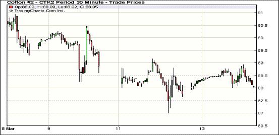 3月13日,市場(chǎng)消息平平,紐約期棉多跌少漲延續(xù)弱勢(shì),主力合約結(jié)束五連跌微幅報(bào)漲,當(dāng)日結(jié)算價(jià)為88.04美分/磅,漲4點(diǎn);7月合約結(jié)算價(jià)88.80美分/磅,跌13點(diǎn)。當(dāng)日市場(chǎng)開盤后受買盤支持震蕩走高,后賣盤涌入打壓期棉迅速走低,主力合約至當(dāng)日最低點(diǎn)87.94美分/磅;這一價(jià)位吸引買盤再次介入,推動(dòng)期棉反彈,該合約最高至88.93美分/磅;尾盤時(shí)買盤獲利回吐部分漲幅,盤終該合約微幅收漲,其他合約漲跌互現(xiàn)。遠(yuǎn)期1212月合約仍收于90美分之下。幾周以來,棉花市場(chǎng)一直在略低于88美分至94美分之間區(qū)間震蕩,一旦棉花價(jià)格跌至88美分以下,總會(huì)有消費(fèi)者買盤出現(xiàn)。當(dāng)日主力合約在買盤支持下弱勢(shì)告漲。