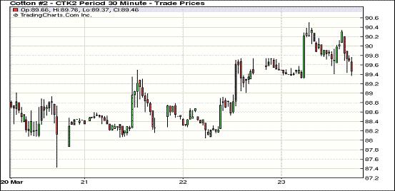 3月23日,美元走低、美股及外部商品市場普遍走高,紐約期棉前兩份合約受支持微幅上揚,其他遠(yuǎn)期合約因基本面偏空小幅收跌。主力5月合約結(jié)算價89.63美分/磅,漲5點,7月合約收于90.27美分/磅,漲4點。市場交投淡靜。當(dāng)日主力合約早盤震蕩走高,并于3月9日來首次突破90美分,最高至90.50美分/磅;后賣盤涌入打壓市場下行,多空力量角力促使該合約在89.5-90.5之間震蕩,盤終微幅上漲。當(dāng)日外部谷物及原油市場全面走高。當(dāng)日紐約期棉受外部市場支持繼續(xù)微漲,然基本面利空仍對遠(yuǎn)期合約形成打壓,預(yù)計期棉下周將繼續(xù)弱勢震蕩格局。