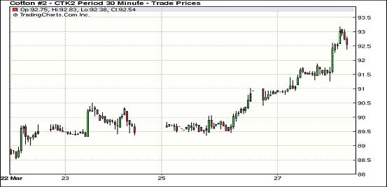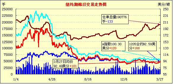 3月27日技術(shù)及投機(jī)買(mǎi)盤(pán)表現(xiàn)活躍促紐約期棉再次全面走高,主力5月合約結(jié)算價(jià)為92.59美分/磅,漲168點(diǎn);7月合約結(jié)算價(jià)93.01美分/磅,漲198點(diǎn),其他遠(yuǎn)期合約漲幅78-153點(diǎn)不等。成交量突破三萬(wàn)手,較前幾日大幅增加。當(dāng)日期棉小幅高開(kāi)后在外部商品市場(chǎng)走高支持下震蕩上揚(yáng),主力合約午盤(pán)前后圍繞91.50美分窄幅波動(dòng),交易后段買(mǎi)盤(pán)入市促市場(chǎng)再次走高,該合約最高至93.18美分/磅,震蕩幅度277點(diǎn);尾盤(pán)時(shí)略有回落回吐部分漲幅,盤(pán)終該合約收于2月21日以來(lái)最高點(diǎn)。遠(yuǎn)期1212月合約尚未突破90美分,當(dāng)日收于89.90美分/磅。本周技術(shù)及投機(jī)買(mǎi)盤(pán)活躍,推動(dòng)期棉連續(xù)兩個(gè)交易日走高。此外,近期美棉銷(xiāo)售活躍引發(fā)市場(chǎng)擔(dān)心未來(lái)幾周供應(yīng)吃緊,這也是刺激投機(jī)買(mǎi)盤(pán)入市的主要原因。