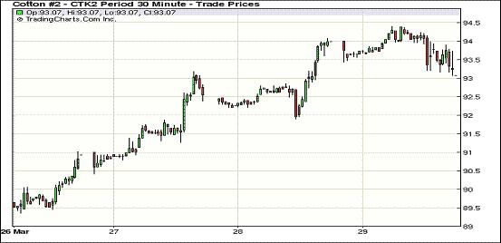 3月29日,雖然美棉出口尚可,但紐約期棉前三份合約受獲利平倉(cāng)賣盤打壓走低,其他遠(yuǎn)期合約繼續(xù)微幅或小幅收漲。主力5月合約結(jié)算價(jià)93.54美分/磅,跌49點(diǎn);7月合約結(jié)算價(jià)93.73美分/磅,跌20點(diǎn)。成交量繼續(xù)處于近期高位。當(dāng)日市場(chǎng)平穩(wěn)開盤,主力合約早盤在買盤支持下上行超過前一日高點(diǎn),當(dāng)日最高至94.39美分/磅,午盤前站穩(wěn)94美分;午盤后買盤獲利平倉(cāng)打壓市場(chǎng)走低,該合約最低至93.07美分/磅,盤終結(jié)束連續(xù)六個(gè)交易日收高的局面,小幅告跌。當(dāng)日外部商品市場(chǎng)也普遍走低。3.16 -3.22一周美國(guó)凈簽約出口本年度陸地棉34654噸,裝運(yùn)74729噸,此數(shù)據(jù)并未對(duì)期棉形成支撐,期棉近期合約小幅收跌,市場(chǎng)密切關(guān)注美國(guó)農(nóng)業(yè)部(USDA)即將公布的美棉種植意向報(bào)告。