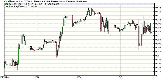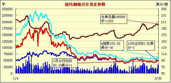 3月30日,美國農(nóng)業(yè)部種植報告促外部谷物市場普遍走高,紐約期棉除主力合約在投機賣盤打壓下微幅收跌外,其他合約均小幅收漲。當日主力5月合約結(jié)算價93.52美分/磅,跌2點。成交量較前兩日略有回落。當日市場平穩(wěn)開盤,主力合約受外部市場走高帶動震蕩上揚,最高至94美分/磅;后美棉種植意向報告公布引發(fā)投機性拋售,市場受打壓迅速回落,該合約最低至92.28美分/磅;因近期供應吃緊,午盤后買盤涌入促市場再次上漲,盤終該合約微幅告跌,但仍較2月底的90.44美分/磅上揚3.4%。美國農(nóng)業(yè)部(USDA)最新預測2012/13年度美棉意向種植面積約1315.5萬英畝,同比減少11%。此數(shù)據(jù)低于美國棉花協(xié)會(NCC)預估的1363萬英畝。