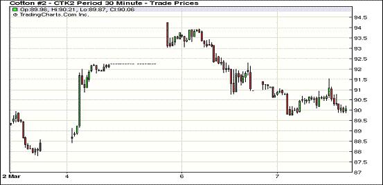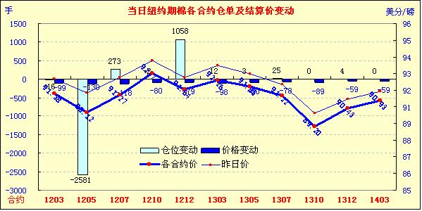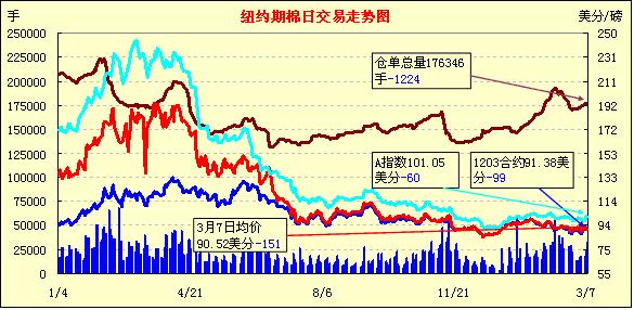 3月7日,雖然經(jīng)濟(jì)面出現(xiàn)利好跡象,但因印度棉花出口政策變數(shù)仍存,紐約期棉延續(xù)前一日的跌勢(shì)再次全面走低,主力5月合約結(jié)算價(jià)90.12美分/磅,跌130點(diǎn),其他遠(yuǎn)期合約跌幅59-118點(diǎn)不等。登記庫(kù)存持續(xù)增加,成交量較前一日大幅減少。當(dāng)日市場(chǎng)開盤后震蕩回落,主力5月合約早盤跌破90美分支撐位,至當(dāng)日最低點(diǎn)89.75美分/磅;之后略有回升,整體圍繞90.50美分上下震蕩,盤終繼續(xù)收低,結(jié)算價(jià)略高于90美分。近期3月合約收于91.38美分/磅,跌99點(diǎn)。當(dāng)日外部谷物及油料市場(chǎng)也普遍收低,原油市場(chǎng)走高。有報(bào)道稱,美聯(lián)儲(chǔ)正考慮推出新措施提振經(jīng)濟(jì)增長(zhǎng),市場(chǎng)圍繞希臘將成功實(shí)施債務(wù)重組計(jì)劃的樂觀情緒升溫,這對(duì)歐美股市形成提振。但目前期棉主要受基本面影響,印度棉花出口禁令發(fā)布后引發(fā)各界強(qiáng)烈不滿,印度政府將于本周五開會(huì)討論,此外美國(guó)農(nóng)業(yè)部也將于周五發(fā)布3月供需預(yù)測(cè)報(bào)告,市場(chǎng)保持關(guān)注。