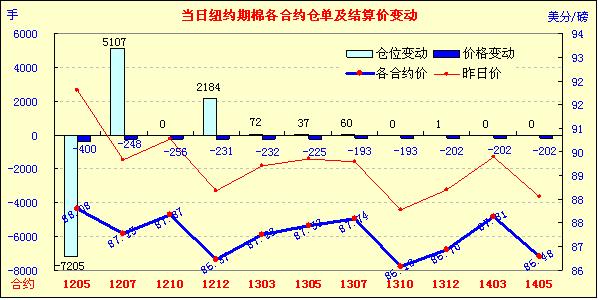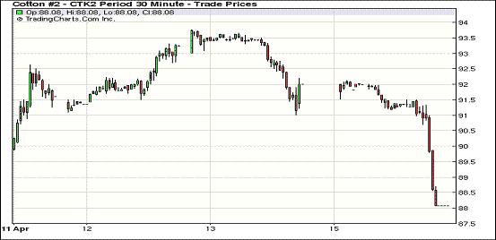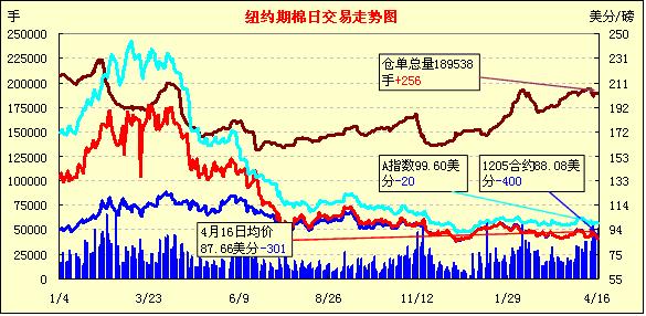 4月16日,紐約期棉市場(chǎng)全面收跌,非商業(yè)賣(mài)盤(pán)對(duì)市場(chǎng)形成打壓,近期5月合約結(jié)算價(jià)88.08美分/磅,以跌停報(bào)收,1207月合約87.25美分,跌248點(diǎn),1212月合約86.37美分,跌231點(diǎn)。當(dāng)日市場(chǎng)小幅低開(kāi),5月合約上半場(chǎng)交易試圖在92美分一線(xiàn)獲得支撐,7月合約在89.5美分一線(xiàn)徘徊,12月合約則在88美分以上尋求支持;交易后期,因非商業(yè)性賣(mài)盤(pán)、相關(guān)期權(quán)賣(mài)盤(pán)、外部商品市場(chǎng)整體下跌,以及上周末德州地區(qū)出現(xiàn)利好降雨,市場(chǎng)整體受壓急速下跌,最終以整體大跌收盤(pán)。