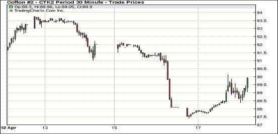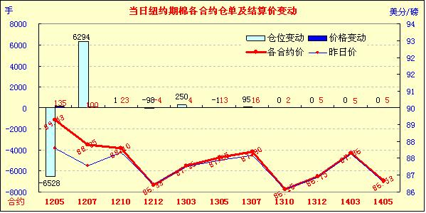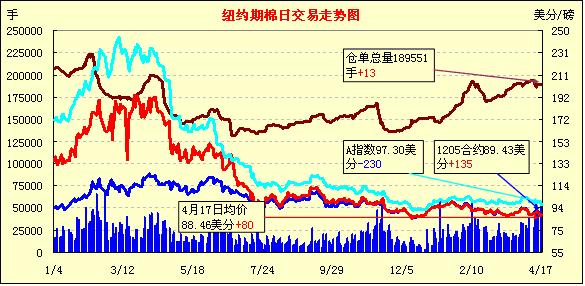 4月17日,紐約期棉市場在外部商品市場回暖帶動下絕大多數(shù)合約收漲,近期5月合約結(jié)算價89.43美分/磅,漲135點,1207月合約88.25美分,漲100點,1212月合約86.33美分,跌4點,其他合約漲幅多在20點以下。當(dāng)日市場平穩(wěn)開盤后重心逐步上移,盤中小幅走高,交易后期美元下跌刺激商品市場整體走強(qiáng),期棉漲幅擴(kuò)大,多數(shù)合約漲幅過百點,交易尾段多數(shù)合約以上漲報收。5月合約轉(zhuǎn)倉交易活躍,成交量維持高位。前一個交易日期貨市場大跌吸引了現(xiàn)貨買家采購美棉,對昨日市場形成支持。另外,日前中國人民銀行宣布自2012年4月16日起銀行間即期外匯市場人民幣兌美元交易價浮動幅度由5‰擴(kuò)大至1%,短期內(nèi)對棉花和其他商品市場沒有影響,但長期看對中國進(jìn)口棉花有利,對美棉出口是利多的。