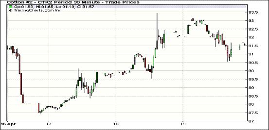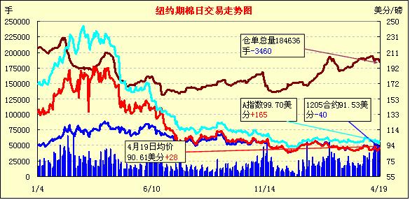 4月19日,受外部谷物市場普遍走高支持,紐約期棉除近期5月合約外收跌外,其他合約繼續(xù)收高,盤終5月合約結(jié)算價91.53美分/磅,跌40點,主力7月合約90.72美分/磅,漲70點,其他遠(yuǎn)期合約也普遍大幅收漲。當(dāng)日5月合約大幅低開,后在外部商品市場走高支持下沖高至93.11美分/磅,由于其下周進入第一交個通知日,投資者結(jié)清頭寸轉(zhuǎn)向遠(yuǎn)月合約,這導(dǎo)致交易后段該合約持續(xù)下跌并以小跌收盤;主力7月合約最高至91.41美分/磅,盤終收于90美分之上。當(dāng)日大豆、玉米及小麥合約普遍走高。據(jù)美國農(nóng)業(yè)部(USDA),4.6-4.12一周美國凈簽約出口本年度陸地棉負(fù)的885噸,裝運59398噸,這符合市場預(yù)期,對期棉市場影響不大。