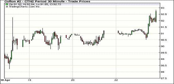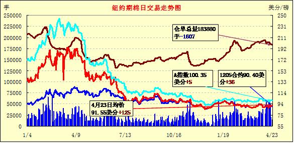 4月23日,盡管外部商品市場多數(shù)收跌,但紐約期棉在投資者買盤支持下全面收漲,5月合約結算價90.40美分/磅,漲36點,主力7月合約92.48美分/磅,漲147點,遠期12月合約89.30美分/磅,漲102點。當日市場平穩(wěn)開盤,近期5月合約早盤沖高回落,最低至89.30美分/磅,午盤后在買盤支持下重新上揚并以上漲收盤;7月合約前半場圍繞91美分震蕩,后受買盤支持上行至當日最高點92.84美分/磅,尾盤時雖略有回落,但仍收于三周以來高位;12月合約也大幅上漲,但尚未突破90美分。5月合約今日將進入第一交個通知日。當前美棉良好的出口簽約率、較低的庫存及植棉面積下降有利于期棉反彈,中國宣布降低海關關稅也對美棉出口形成利好支持,預計短期將延續(xù)反彈格局。