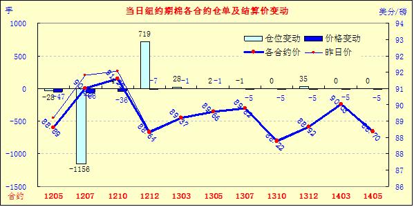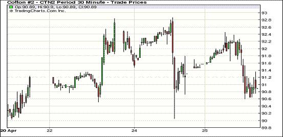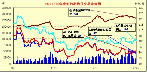 4月25日,紐約期棉延續(xù)前一日的跌勢(shì)繼續(xù)收低,近期5月合約結(jié)算價(jià)88.89美分/磅,跌47點(diǎn),主力7月合約90.80美分/磅,跌66點(diǎn),遠(yuǎn)期12月合約88.64美分/磅,跌7點(diǎn)。當(dāng)日市場(chǎng)較為平淡,成交量較前幾日明顯縮減。當(dāng)日期棉開盤后震蕩走高,主力7月合約最高至92.45美分/磅;午盤后受賣盤打壓回落,當(dāng)日最低至90.60美分/磅,震蕩幅度185點(diǎn);尾盤時(shí)雖略有反彈回補(bǔ)部分跌幅,但終以陰跌收盤。遠(yuǎn)期12月合約當(dāng)日最高至89.55美分/磅,盤終微幅收跌。當(dāng)日外部商品市場(chǎng)漲跌不一,大豆及原油期貨收漲,小麥及玉米告跌。