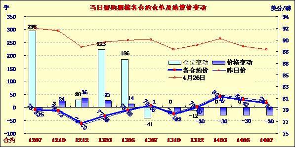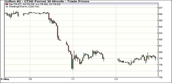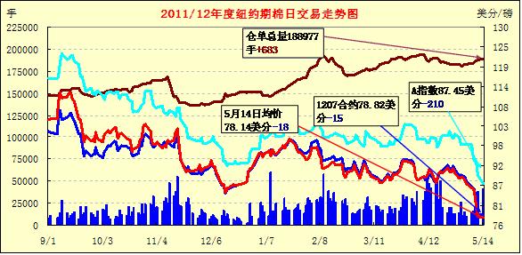 5月14日美元走強(qiáng)、外部商品市場多數(shù)收跌,同時市場圍繞歐債危機(jī)的憂慮加深,但投機(jī)買盤在一定程度上對期棉形成支持,當(dāng)日紐約期棉漲跌互現(xiàn),主力7月合約收于78.82美分/磅,跌15點(diǎn),遠(yuǎn)期12月合約76.70美分/磅,漲36點(diǎn)。當(dāng)日主力合約波幅較大,開盤后延續(xù)前幾日跌勢至當(dāng)日最低點(diǎn)77.85美分/磅,此低位吸引投機(jī)買盤入市,促該合約震蕩上行,盤中最高至79.90美分/磅,仍為能突破80美分關(guān)鍵阻力位;盤終該合約微幅下跌。12月合約小幅反彈。