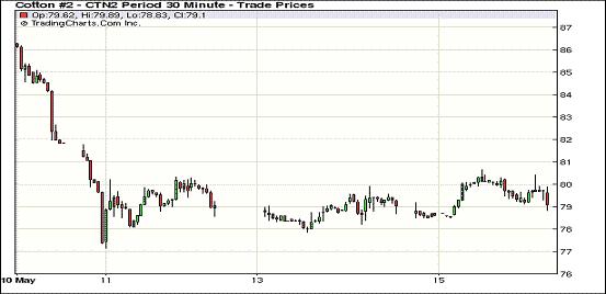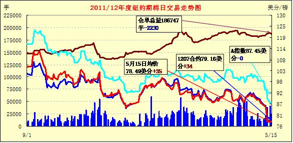 5月15日在投機(jī)買盤的支持下,紐約期棉主力合約自5月1日以來首次上揚(yáng),當(dāng)日收于79.16美分/磅,漲34點(diǎn),12月合約77.33美分/磅,漲63點(diǎn),其他遠(yuǎn)期合約漲幅68-102點(diǎn)不等。當(dāng)日市場(chǎng)開盤后震蕩走高,主力合約早盤突破80美分阻力位,最高至80.65美分/磅,交易后段該合約回落回吐部分漲幅,盤終小幅收漲。當(dāng)日外部谷物市場(chǎng)普遍漲幅較大,原油市場(chǎng)收跌。期棉自5月以來持續(xù)下跌,跌幅約9-10美分,目前的低位吸引了投機(jī)買盤涌入,促市場(chǎng)止跌反彈。