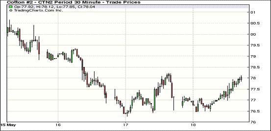 5月18日在空頭獲利平倉盤的支持下,紐約期棉一改5月份以來的弱勢大幅上揚,主力7月合約結(jié)算價77.99美分/磅,漲134點,12月合約75.21美分/磅,漲131點,其他遠期合約也普遍大幅收漲。當(dāng)日市場小幅高開,主力合約開盤后略有回落,后在買盤的支持下持續(xù)震蕩上揚并以大漲收盤。該合約本周較上周跌98點。當(dāng)日外部市場漲跌不一,小麥機玉米期貨走高,大豆及原油市場走弱。自5月份以來,期棉持續(xù)下跌,累計跌幅超過11美分。17日,主力合約收于近兩年新低,市場處于超賣狀態(tài),昨日貿(mào)易商低位平倉,促使期棉大幅反彈。