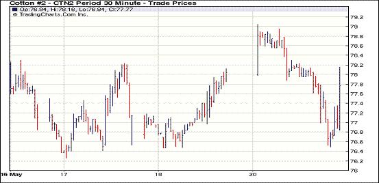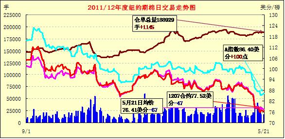 5月21日,在賣盤打壓下,紐約期棉多數(shù)合約收低,主力7月合約結(jié)算價(jià)77.52美分/磅,跌47點(diǎn),遠(yuǎn)期12月合約76.67美分/磅,跌30點(diǎn)。當(dāng)日市場平穩(wěn)開盤,主力合約短暫走高至當(dāng)日最高點(diǎn)79.05美分/磅;后賣盤涌入打壓該合約持續(xù)走低,當(dāng)日最低至76.49美分/磅,較上周五最低點(diǎn)僅高出0.02美分,震蕩幅度256點(diǎn);尾盤時(shí)雖有所反彈,但終以陰跌收盤。當(dāng)日外部股市及商品市場表現(xiàn)較為強(qiáng)勁。五月以來紐約期棉持續(xù)下跌,低棉價(jià)吸引投機(jī)性買盤引發(fā)一波為期較短的反彈,但目前基本面上無利好消息,歐債危機(jī)憂慮仍對(duì)市場造成下行壓力,預(yù)計(jì)期棉短期仍保持弱勢。