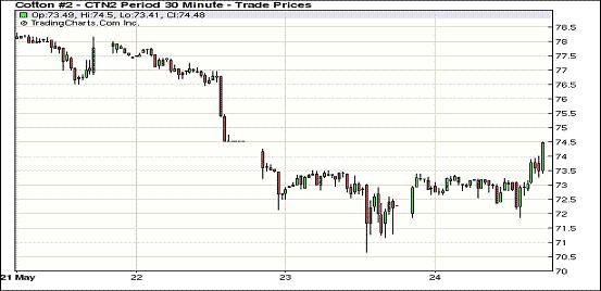5月24日,在美棉出口周報(bào)數(shù)據(jù)利好的支持下,紐約期棉一改前幾日的弱勢大幅反彈,主力7月合約結(jié)算價(jià)73.94美分/磅,漲243點(diǎn),遠(yuǎn)期12月合約70.67美分/磅,漲192點(diǎn),其他合約也普遍大幅收漲。當(dāng)日市場小幅高開,主力7月合約大部分時(shí)間在72.5-73.5之間窄幅震蕩;午盤后受賣盤打壓下行至當(dāng)日最低點(diǎn)71.87美分/磅,此低點(diǎn)吸引商業(yè)性買盤大量涌入,促該合約大幅反彈并收漲。非商業(yè)投資者也普遍在周末前低位買入,對(duì)市場形成支持。5.11-5.17日美國凈簽約出口本年度陸地棉26807噸,較近四周平均增加19%;裝運(yùn)本年度陸地棉61326噸,較上周增加39%,美棉銷售數(shù)據(jù)利好刺激期棉強(qiáng)勢反彈。