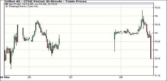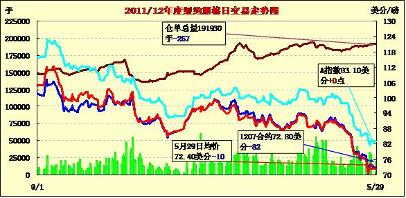 5月29日,紐約期棉漲跌互現(xiàn),主力7月合約結(jié)算價72.80美分/磅,跌82點,遠期12月合約71.30美分/磅,漲41點。投資者在小長假后表現(xiàn)較為活躍,成交量約3.5萬手。當日市場平穩(wěn)開盤,主力7月合約上半場圍繞74美分窄幅震蕩;午盤時分買盤發(fā)力促該合約震蕩上行并突破75美分,當日最高至75.33美分/磅;然美元走強及外部市場走低對市場形成拖累,投機性賣盤在尾盤涌入打壓該合約回落并終以陰跌收盤。12月合約當日中幅收漲。市場圍繞希臘將繼續(xù)留在歐元區(qū)的樂觀情緒升溫,但西班牙債務問題又引發(fā)擔憂,一個月內(nèi)第三次下調(diào)西班牙信用評級,歐洲危機解決進程仍不容樂觀,這對全球商品市場形成打壓。此外,棉花基本面持續(xù)疲軟,投機性買賣盤相互角力,導致期棉主力當日沖高回落。