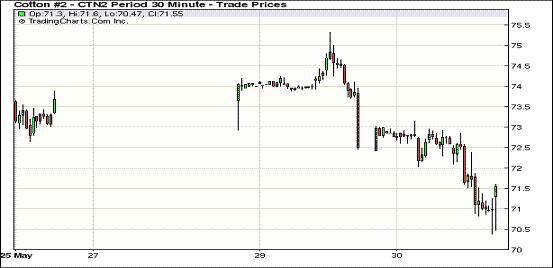 5月30日,因西班牙銀行業(yè)危機(jī)的加劇再度引發(fā)了市場對歐元區(qū)前景的擔(dān)憂,美元走高、美股及商品市場普遍下挫,紐約期棉同樣受累大幅收跌,主力7月合約結(jié)算價(jià)70.91美分/磅,跌189點(diǎn),遠(yuǎn)期12月合約70.28美分/磅,跌102點(diǎn)。市場交易活躍,成交量突破5萬手。期棉低開低走,主力7月合約開盤后一路下行,當(dāng)日最低至70.38美分/磅,盤終再創(chuàng)新低,收于近兩年最低點(diǎn)。12月合約在跌破70美分支撐位之后獲得支持,盤終略有反彈但終收跌百余點(diǎn)。投資者希望在7月合約交割前結(jié)清頭寸,基金轉(zhuǎn)倉交易活躍。西班牙銀行業(yè)出現(xiàn)存款減少的情況,其銀行的零售與企業(yè)存款下降至1.624萬億歐元,創(chuàng)下自歐元區(qū)債務(wù)危機(jī)爆發(fā)以來的最低水平。圍繞西班牙及歐元區(qū)危機(jī)的擔(dān)憂情緒促使投資者拋售歐元買進(jìn)美元,導(dǎo)致美元走強(qiáng),股市及商品市場普遍收跌。