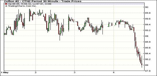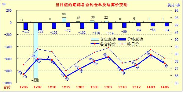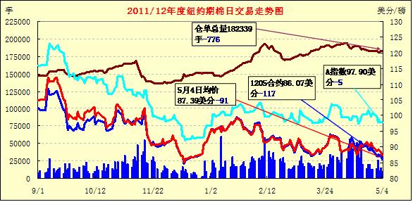 5月4日,因美元走強(qiáng)及外圍市場(chǎng)走低,紐約期棉繼續(xù)收跌,主力7月合約收于87.99美分/磅,跌122點(diǎn),遠(yuǎn)期12月合約85.80美分/磅,跌72點(diǎn)。當(dāng)日市場(chǎng)高開低走,主力7月合約早盤在89.2-89.6美分之間窄幅震蕩,后外圍市場(chǎng)走弱引發(fā)投機(jī)性賣盤介入,該合約受打壓下行,當(dāng)日最低至87.91美分/磅,盤終收跌百余點(diǎn)。12月合約當(dāng)日最低至85.50美分/磅,為2011年12月以來最低點(diǎn)。當(dāng)日外部市場(chǎng)大豆及玉米市場(chǎng)上揚(yáng),小麥及原油期貨收跌。期棉在連跌3日后,可能會(huì)有所反彈,市場(chǎng)關(guān)注美國農(nóng)業(yè)部將于10日公布的全球供需預(yù)測(cè)報(bào)告。