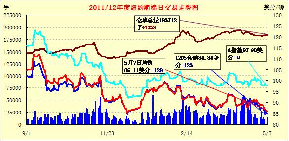 5月7日,受投機(jī)性賣盤打壓,紐約期棉延續(xù)上周的弱勢繼續(xù)下跌,主力7月合約收于12月下旬以來最低位,當(dāng)日結(jié)算價(jià)86.67美分/磅,跌132點(diǎn),遠(yuǎn)期12月合約84.73美分/磅,跌107點(diǎn)。當(dāng)日市場開盤后震蕩走高,主力合約早盤至當(dāng)日最高點(diǎn)88.42美分/磅,后美元走強(qiáng)及外圍商品市場走弱拖累期棉下行,該合約下探至支撐位86.55美分后遭遇更多賣盤,尾盤時(shí)分至最低點(diǎn)86.10美分/磅,盤終前略有反彈但終以大跌收盤。遠(yuǎn)期12月合約當(dāng)日最低至84.26美分/磅,為去年12月中旬以來最低點(diǎn)。棉花基本面持續(xù)疲軟;上周印度政府宣布放開棉花出口,這令國際市場上棉花供應(yīng)量增加,對期棉造成更多壓力。各方密切關(guān)注美國農(nóng)業(yè)部(USDA)將于10日公布的全球棉花供需預(yù)測報(bào)告。