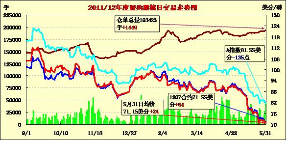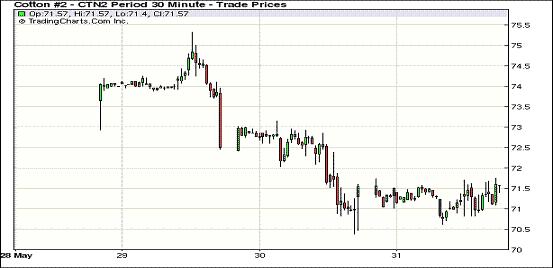 5月31日,本月最后一個交易日,紐約期棉市場不顧外部商品市場整體走弱,以全面小幅上漲收盤,近期7月合約結(jié)算價71.55美分,漲64點,10月合約71.85美分,漲26點,12月合約70.35美分,漲7點。12月合約持倉量超過7月合約。當日市場穩(wěn)定開盤,盤中小幅下跌,交易后期回補盤中跌幅,最終市場整體收漲。外部商品市場受美國經(jīng)濟數(shù)據(jù)不佳影響整體下跌,期棉因商業(yè)性買盤支持而收穩(wěn)。5月份期棉價格下跌幅度近20%,月底最后一個交易日吸引少量買盤。全球經(jīng)濟狀況仍令人憂慮,消費層面暫無太大利好,期棉市場壓力依舊,難言真正反彈。技術(shù)面上,遠期市場在66美分有支撐。