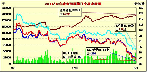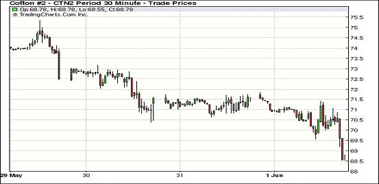 6月1日,因美國及中國經(jīng)濟(jì)數(shù)據(jù)疲軟對(duì)市場形成打壓,同時(shí)投資者對(duì)歐洲局勢持續(xù)擔(dān)憂,導(dǎo)致全球股市及商品市場普遍承壓,紐約期棉全面大幅收跌,主力7月合約結(jié)算價(jià)68.59美分/磅,跌296點(diǎn),遠(yuǎn)期12月合約67.61美分/磅,跌274點(diǎn)。當(dāng)日市場小幅高開,主力早盤窄幅震蕩,午盤后至當(dāng)日最高點(diǎn)71.85美分/磅,后受外部市場拖累,該合約于尾盤時(shí)分跌至跌停板68.55美分/磅,后略有反彈但終以大跌收盤。其他合約也普遍大幅收跌。當(dāng)日外部市場也普遍走低。美國就業(yè)數(shù)據(jù)不佳,中國官方5月份采購經(jīng)理人指數(shù)(PMI)從4月份的53.3降至50.4,這些數(shù)據(jù)令全球市場承受壓力。