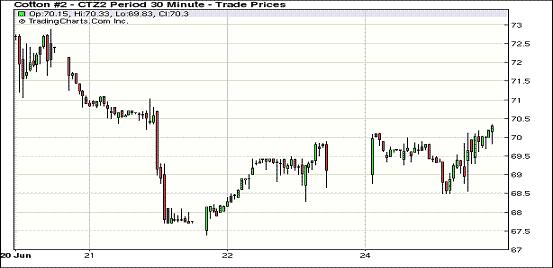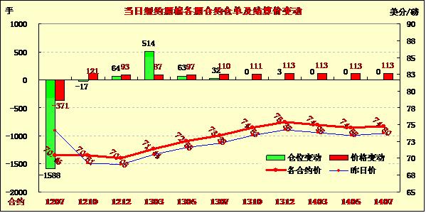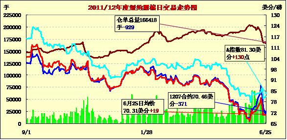 6月25日,在外部谷物市場大幅走高的帶動下,紐約期棉除近期七月合約外普遍大幅收漲,主力12月合約結(jié)算價70.05美分/磅,漲93點。當(dāng)日為7月合約的第一交割通知日,投資者普遍結(jié)清頭寸導(dǎo)致該合約大幅下挫,盤終收于70.46美分/磅,跌371點。當(dāng)日市場小幅低開,歐洲方面的負(fù)面消息使美元走高,主力合約早盤承壓下挫,午盤前后至當(dāng)日最低點68.50美分/磅;后外部谷物市場大幅上揚刺激該合約也震蕩走高,交易后段波幅較大,最終以大幅上漲收盤。因投資者對歐洲債務(wù)危機的擔(dān)憂大大抵消了美國國內(nèi)利好經(jīng)濟數(shù)據(jù)帶來的提振作用,昨日美國股市及原油期貨走低,但谷物市場因主產(chǎn)區(qū)天氣不利大幅上揚,也帶動紐約期棉市場的上漲,但棉花基本面毫無改善,市場仍維持偏空格局,投資者關(guān)注美國農(nóng)業(yè)部(USDA)將于月底公布的美棉實際種植面積。