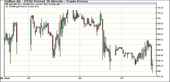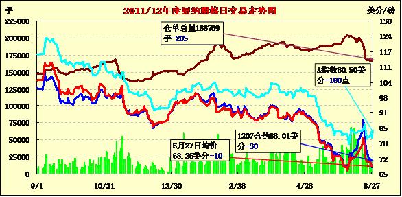 6月27日,紐約期棉市場(chǎng)交易清淡,各合約小幅收跌,主力12月合約67.96美分/磅,跌24點(diǎn)。外部商品市場(chǎng)漲跌不一,歐美股市上揚(yáng),期棉12月合約當(dāng)日弱態(tài)主要出現(xiàn)在尾盤,該合約早盤微幅高開,盤中多在68.5-69美分區(qū)間窄幅波動(dòng),交易最后階段出現(xiàn)下跌,最終結(jié)算價(jià)低于68美分?;久嫔厦绹轮莺椭心厦迏^(qū)局部地區(qū)氣溫過高,棉農(nóng)擔(dān)心影響棉花生產(chǎn),分析師指出,27日該消息對(duì)市場(chǎng)未見影響,需關(guān)注事態(tài)發(fā)展動(dòng)向。