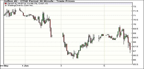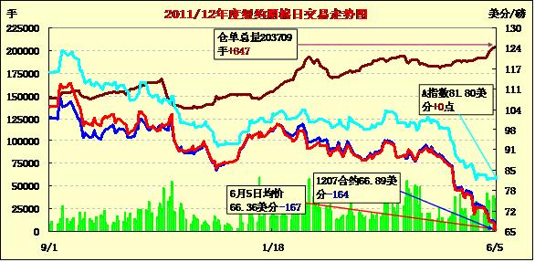 5月5日,外部市場美國股市、原油、黃金和大豆市場收漲,ICE棉花期貨因美國最大棉區(qū)德州出現(xiàn)利好降雨而大幅收跌。近期7月合約結(jié)算價66.89美分/磅,跌164點,主力12月合約65.36美分,跌170點。近四周以來,12月合約累計跌幅達(dá)到20美分以上。當(dāng)日市場早盤交易因技術(shù)面超賣而反彈,外部市場股市、原油和黃金期貨震蕩上揚,而美國德州西部地區(qū)出現(xiàn)利好降雨,有助美國棉花產(chǎn)量提升,期棉市場拋開外部市場走強動能,全面下跌。分析師指出,目前全球經(jīng)濟整體仍處于壓力狀態(tài),消費形勢堪憂,美棉產(chǎn)量看增對期棉形成壓力,技術(shù)上12月合約將進(jìn)一步探試60美分。