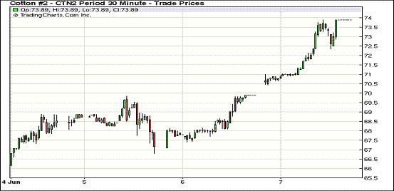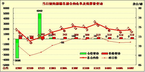 6月7日,受中國出臺經(jīng)濟(jì)刺激措施推動,全球股市及商品市場普遍走高,紐約期棉同樣受助再次大幅收漲,近期7月合約結(jié)算價(jià)73.89美分/磅,漲400點(diǎn),12月合約72.28美分/磅,漲392點(diǎn)。當(dāng)日期棉大幅高開,空頭平倉助7月合約一路上行,尾盤時段至漲停板并延續(xù)至盤終,該合約在過去兩個交易日連續(xù)漲停,累計(jì)漲幅達(dá)700點(diǎn)。7月與12月合約價(jià)差擴(kuò)大到151點(diǎn),投資者普遍要在6月25日(7月合約第一交割通知日)結(jié)清頭寸,基金轉(zhuǎn)倉交易活躍。中國人民銀行決定,自2012年6月8日起下調(diào)金融機(jī)構(gòu)人民幣存貸款基準(zhǔn)利率,此消息刺激全球股市及商品市場普遍走高。此外,上周美棉出口數(shù)據(jù)繼續(xù)利好也對期棉形成一定支持。