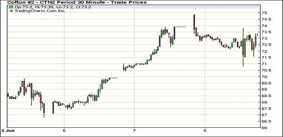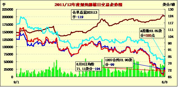 6月8日在投機(jī)賣盤的打壓下,紐約期棉未能延續(xù)前兩日的漲勢(shì)全面收陰,近期7月合約結(jié)算價(jià)72.90美分/磅,跌99點(diǎn),12月合約69.88美分/磅,跌240點(diǎn)。市場(chǎng)表現(xiàn)活躍,成交量達(dá)6.4萬(wàn)手。當(dāng)日期棉延續(xù)前一日的強(qiáng)勢(shì)大幅高開,近期7月合約短暫上行后受賣盤打壓震蕩走低,午盤前后波動(dòng)較大,當(dāng)日最低至70.79美分/磅;尾盤時(shí)該合約反彈回補(bǔ)部分跌幅,但終以陰跌收盤。12月合約當(dāng)日高開低走,盤終收跌200余點(diǎn)。外部市場(chǎng)除玉米小幅收漲外,其他普遍收跌。期棉在本周三、周四連續(xù)兩日漲停,但基本面疲軟狀況毫無(wú)改善,經(jīng)濟(jì)前景不確定性仍存,美國(guó)主產(chǎn)棉區(qū)持續(xù)降雨對(duì)期棉造成壓力,此外投機(jī)賣盤也伺機(jī)入市,多方利空影響導(dǎo)致市場(chǎng)掉頭收跌。
