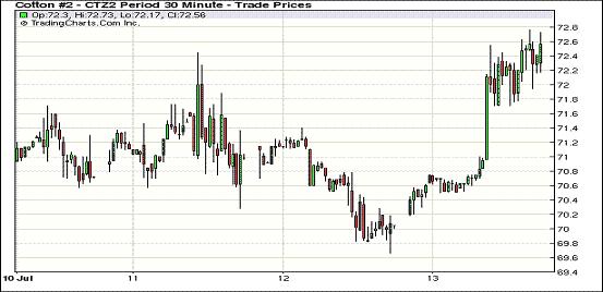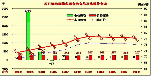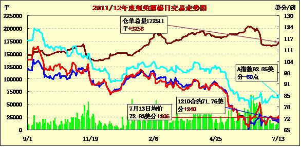 7月13日,美元走弱、美股及外圍谷物市場普遍走強,紐約期棉受提振也大幅反彈,近期10月合約結(jié)算價71.76美分/磅,漲240點;主力12月合約72.66美分/磅,漲273點;其他遠(yuǎn)期合約漲幅也均在200點以上。市場表現(xiàn)趨于活躍,成交量超過兩萬手。當(dāng)日市場高開高走,主力12月合約早盤在70.5-71美分之間窄幅震蕩,午盤后外圍股市及商品市場走強帶動該合約大幅上揚,交易后半段基本運行在72美分之上,盤終大幅收漲。昨日中國經(jīng)濟數(shù)據(jù)緩和了市場對中國潛在的硬著陸或進一步損及全球經(jīng)濟增長的憂慮,全球股市和油價上漲;此外谷物市場因出現(xiàn)嚴(yán)重旱情而走高,這也對棉花市場形成提振。