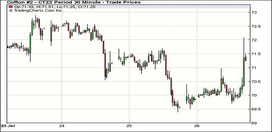 7月26日,雖然外部谷物市場(chǎng)普遍大幅下跌,但紐約期棉受美元走低、印度旱情及商業(yè)買盤支持反彈收高,近期10月合約結(jié)算價(jià)70.68美分/磅,漲158點(diǎn);主力12月合約結(jié)算價(jià)71.39美分/磅,漲188點(diǎn);其他遠(yuǎn)期合約漲幅146-177點(diǎn)不等。當(dāng)日市場(chǎng)小幅高開(kāi),受上周美棉出口數(shù)據(jù)低迷影響,主力合約早盤在70-70.4美分之間窄幅震蕩,午盤前后一波商業(yè)買盤入市促市場(chǎng)短暫走高后又震蕩回落;尾盤時(shí)分印度旱情及美元走低刺激市場(chǎng)迅速上揚(yáng),該合約盤終大幅收漲。12/3月合約價(jià)差78點(diǎn),較前一日減11點(diǎn)。當(dāng)日美元走低及股市走高,同時(shí)作為全球第二大產(chǎn)棉國(guó)的印度出現(xiàn)旱情,其主產(chǎn)棉區(qū)古吉拉特西部季風(fēng)降雨量同比減幅達(dá)97%,此外商業(yè)買盤在期棉持續(xù)三日下跌后入市,這些因素促使期棉市場(chǎng)當(dāng)日強(qiáng)勢(shì)反彈。
