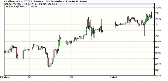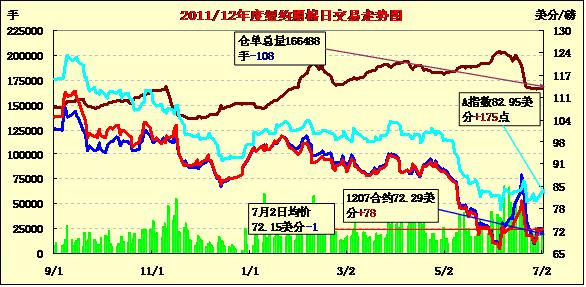 7月2日,雖然經濟面出現(xiàn)利空消息,但紐約期棉在外部谷物市場走高提振下連續(xù)第三個交易日收漲,主力12月合約結算價72.02美分/磅,漲69點。近期7月合約收于72.15美分/磅,當日發(fā)出147張通知單。7月4日(本周三)為美國獨立日公共假期,紐約期棉市場休市一天。當日市場平穩(wěn)開盤,主力合約早盤震蕩走高;午盤后受中美經濟數(shù)據(jù)利空打壓快速回落,跌至當日最低點69.97美分/磅,交易后段隨著外部谷物市場的強勢上揚,該合約受支持反彈并連續(xù)第三個交易日收漲。其他合約漲幅67-86點不等。6月份美國制造業(yè)意外出現(xiàn)萎縮,為2009年以來首次;6月份匯豐中國制造業(yè)采購經理人指數(shù)(PMI)從5月份的48.4降至48.2,為連續(xù)第八個月下滑,經濟面利空對期棉市場形成壓力。