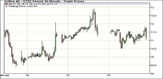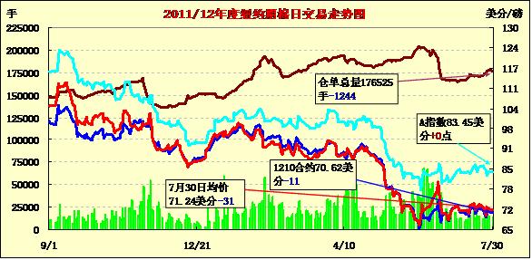 7月30日,雖然外部谷物市場受美國旱情刺激大幅上揚,但紐約期棉在基本面疲弱影響下小幅收跌,近期10月合約結(jié)算價70.62美分/磅,跌11點;主力12月合約結(jié)算價71.13美分/磅,跌32點。市場交投清淡,成交量不足萬手。當日市場平穩(wěn)開盤,主力合約上周主要在69-73美分之間震蕩,本周一早盤受投機賣盤打壓至當日最低點70.50美分/磅,后在外部市場提振下低點反彈,但基本面疲軟限制期棉反彈空間,該合約盤終小幅收跌。本周期棉市場可能會維持振蕩格局,等待一系列經(jīng)濟事件的揭曉。市場將重點關(guān)注周三美國聯(lián)邦公開市場委員會會議、周四歐洲央行的貨幣政策會議和周五美國的非農(nóng)就業(yè)數(shù)據(jù)。
