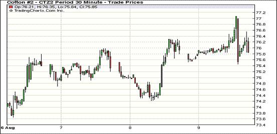 8月9日,紐約期棉除近期10月合約微幅上漲外,其他合約普遍小幅收跌,10月合約結(jié)算價75.59美分/磅,漲9點;主力12月合約結(jié)算價75.95美分/磅,跌5點。市場密切關(guān)注美國農(nóng)業(yè)部將于今晚發(fā)布的供需預測報告。當日市場小幅低開,主力12月合約上半場在75.8-76美分之間窄幅震蕩;午盤后買盤涌入促該合約上揚,盤中自5月中旬以來首次突破77美分,當日最高至77.07美分/磅,震蕩幅度162點;后買盤獲利平倉回吐全部漲幅,盤終該合約微幅收跌。當日外部商品市場普遍上揚。雖然市場預計美國農(nóng)業(yè)部報告將下調(diào)全球棉花期末庫存,但12/13年度庫存仍會繼續(xù)攀升。紐約期棉在報告公布前一個交易日小幅盤整,靜候報告指引方向。