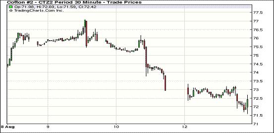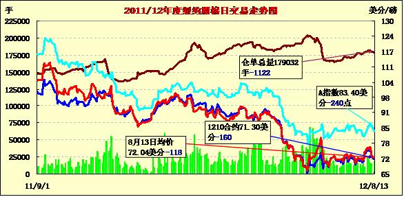8月13日,在市場擔(dān)憂全球需求前景不佳、技術(shù)性賣盤及外部商品市場大跌的共同作用下,ICE期棉延續(xù)前一個(gè)交易日的跌勢繼續(xù)走低,近期10月合約結(jié)算價(jià)71.30美分/磅,跌160點(diǎn);主力12月合約結(jié)算價(jià)71.69美分/磅,跌133點(diǎn)。當(dāng)日主力12月合約早盤在72.8美分/磅上下波動,當(dāng)日最高至73.33美分/磅;后技術(shù)性賣盤入市拖累市場大幅下跌,該合約最低至71.69美分/磅,震蕩幅度174點(diǎn);尾盤時(shí)略有反彈回補(bǔ)部分跌幅,盤終仍大幅收跌。當(dāng)日外部商品市場也普遍大幅走低。上周美國農(nóng)業(yè)部(USDA)報(bào)告調(diào)高全球棉花產(chǎn)量及期末庫存,同時(shí)消費(fèi)被調(diào)低,這使市場對需求前景產(chǎn)生擔(dān)憂,拖累期棉繼續(xù)下跌。