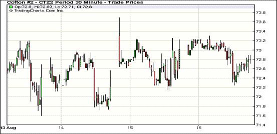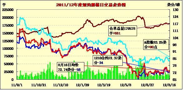 8月16日,紐約期棉結(jié)束前兩個(gè)交易日的漲勢(shì)全面回落,近期10月合約收于72.37美分/磅,跌34點(diǎn);主力12月合約結(jié)算價(jià)72.59美分/磅,跌52點(diǎn)。市場(chǎng)交易持續(xù)清淡,成交量在萬手以下徘徊。當(dāng)日市場(chǎng)平穩(wěn)開盤,主力12月合約早盤圍繞73.10美分/磅窄幅震蕩;后美國(guó)主產(chǎn)棉區(qū)三角洲及德州局部出現(xiàn)利好降雨對(duì)市場(chǎng)形成打壓,同時(shí)在連續(xù)兩個(gè)交易日收漲之后,投機(jī)賣盤入市也打壓期棉下行,主力合約當(dāng)日最低至72.25美分/磅;尾盤時(shí)略有反彈回補(bǔ)部分跌幅,盤終該合約中幅收跌。當(dāng)日外部大豆及玉米期貨走低,小麥及原油期貨上揚(yáng)。雖然紐約期棉前兩個(gè)交易日在中國(guó)進(jìn)口大增及外部商品市場(chǎng)走高支持下連續(xù)收漲,但上周的美國(guó)農(nóng)業(yè)部(USDA)報(bào)告仍舊對(duì)期棉形成壓力,基本面疲軟使期棉難以延續(xù)漲勢(shì)。