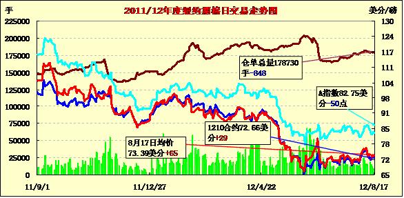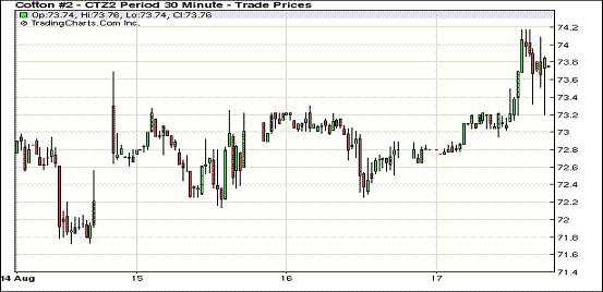 8月17日,受美元走低、美股及外部商品市場走高提振,紐約期棉反彈上揚(yáng),近期10月合約收于72.66美分/磅,漲29點(diǎn);主力12月合約73.30美分/磅,漲71點(diǎn)。市場交易持續(xù)清淡。當(dāng)日市場平開高走,主力合約早盤在73.2美分下方徘徊;后外部市場走高帶動(dòng)期棉上行,該合約突破74美分阻力位,當(dāng)日最高至74.17美分/磅;尾盤時(shí)分買盤獲利平倉回吐部分漲幅,盤中該合約中幅收漲。本周,12月合約較上周漲28點(diǎn),3月合約漲18點(diǎn)。